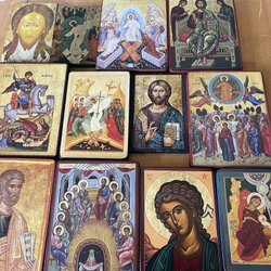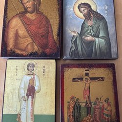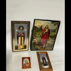 En samling av ikoner med religiösa motiv. 3 är gjorda i Grekland och har certifikat som tillåter export från Grekland. 3 är gjorda enligt den gamla bysantinska stilen på duk och gammalt trä.
