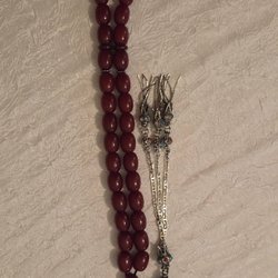 Elegant handgjord bönkedja med gröna, glänsande pärlor och detaljer i silver med turkosa och röda stenar.