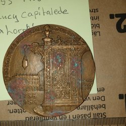 Medaljong med religiösa motiv. Framsidan visar Jesus med änglar och knäböjande figurer, med texten "CHARLOTTE DE LAMBL" och datumet "4 jun 1873". Baksidan visar en dopscen med texten "BAPTÊME 29 NOV. 1860". Vikt ca 160g.