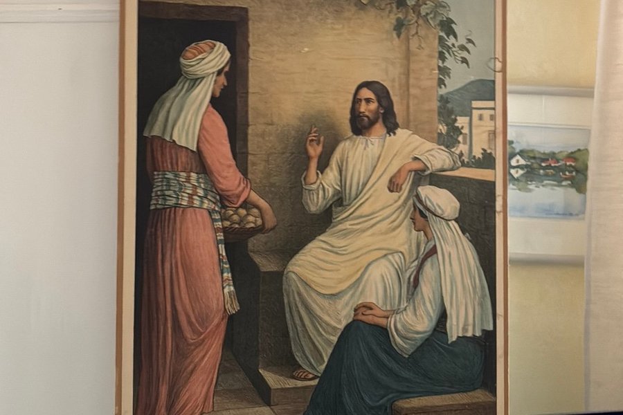 Skolplansch föreställande Jesus med Marta och Maria. Signerad Paul Steffensen 1920. Från Nordstets och söners förlag . 64x44 cm.