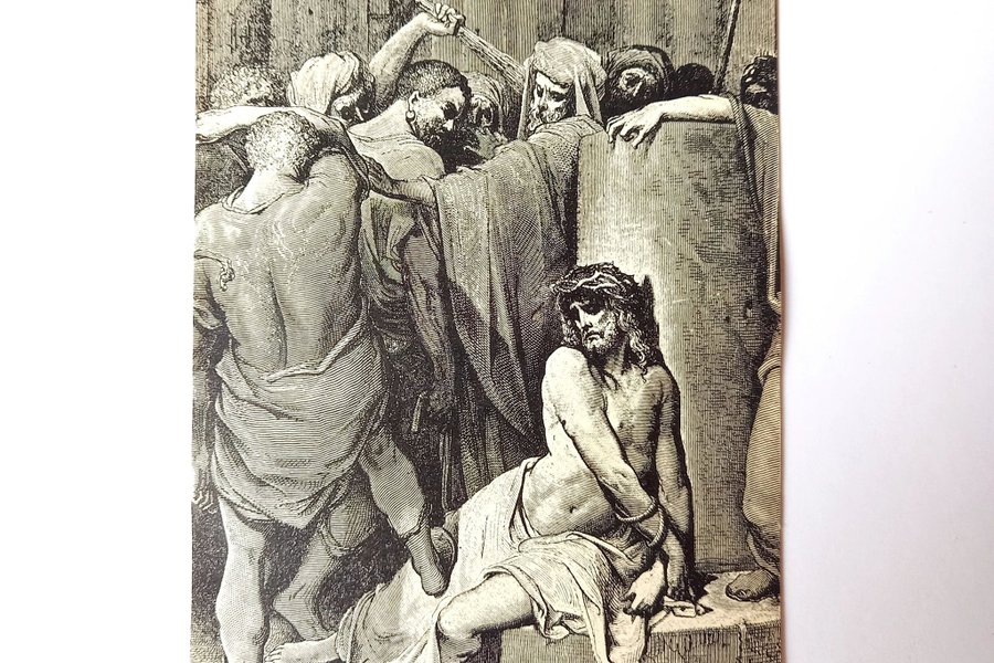 Bild med religiöst motiv. Bilden föreställer en scen med flera figurer, där en central figur sitter med en törnekrona på huvudet. Runt omkring står andra figurer, varav en håller ett vapen. Bilden är i svartvitt med detaljerade linjer.