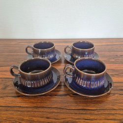 4 kaffekoppar med fat ur servisen Ulvåsa som formgavs av Herbert Perje 1941 och som var i produktion till 1946. Fint skick överlag men en av kopparna har en mindre skada på kanten som har blivit missfärgad. Se bilder för egen uppfattning om skick. Kopparna är ca 6 cm höga och diameter upptill på ca 7 cm. Faten är ca 13 cm i diameter.