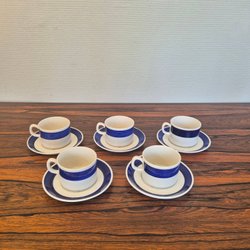 2 kaffekoppar med fat från klassiska servisen Vinranka som anses vara den mest framgångsrika servisen som Gefle tillverkade. Formgiven av Arthur Percy och var i produktion mellan 1938-1969. Fint skick för sin ålder men krackeleringar och missfärgningar finns samt att det finns mindre nagg på ringarna undertill. Se bilder för egen uppfattning om skick. Kopparna är ca 6,5 cm höga och diameter upptill på ca 7 cm. Faten är ca 13,5 cm i diameter.