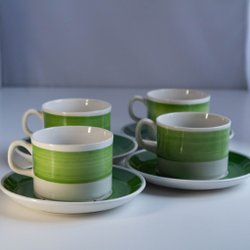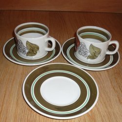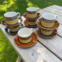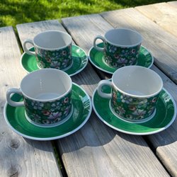 6 fina kaffekoppar m fat – Blå Vinranka – från Gefle. Design Arthur Percy. De är i gott bruksskick med visst ”användarslitage”, 2 av kopparna med invändiga krackeleringar, se bilder. Inga nagg, sprickor e d skador! Kopparna är ca 6,6 – 6,7 cm höga och 7,3 – 7,4 cm i diameter, fatens diameter ca 13,5 – 13,7 cm.