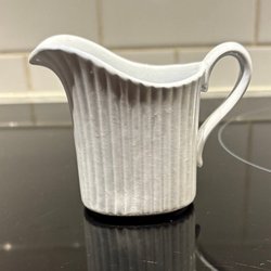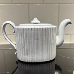 Ljuslila tekopp/kaffekopp och fat i färgen Lavendel med räfflad design. Modellen är gjord av Gefle Porslinsfabrik och designat av Arthur Percy i början av 1940-talet. Modellen heter AR.