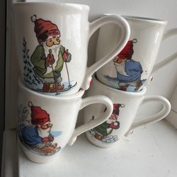 Fint skick, inga sprickor ett pytte litet nagg på en kopp man ej tänker på. Lite blekt i färgen på vissa ställen. Perfekt för retro-fika, samlare eller som present.