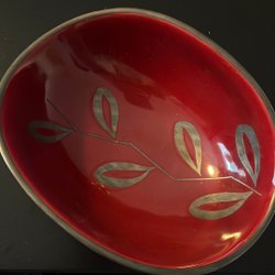 Faten har en djup röd glasyr och handmålade gulddetaljer – klassisk svensk keramik i tidstypisk design.