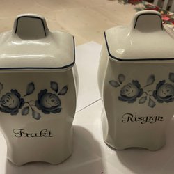 Set med kryddburkar från Gefle. Innehåller burkar för: Potatismjöl, Havregryn, Risgryn, Kaffe, Socker, Ingefära, Kryddpeppar, Vitpeppar och Nejlikor.
