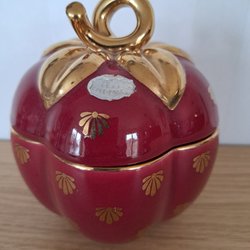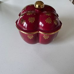 Skål Rubin i mörkrött med guldkant och guldfärgad dekor i botten. Tillverkad av Gefle. 25 cm i diameter. Inte naggad i porslinet.