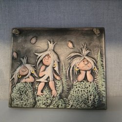Dekorativ keramikplatta med motiv av en tjur, blommor och en sjö. Signerad på baksidan av Rune P med årtalet 78.