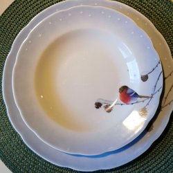 Ärvd servis som mest stått i min mors vitrinskåp men några tallrikar är ibland använda vid jul. Det finns skrapmärken men tyvärr tror jag mest från förvaringen än från bestick. Mattallrikarna är mer använda än de djupa. Inga nagg.