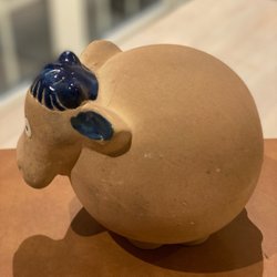 En dekorativ keramikfigur med ett unikt utseende. Den har en brun kropp med blå prickar och en guldfärgad huvud.
