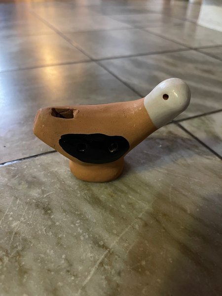 En söt, handgjord fågelvisselpipa i keramik. Den är formad som en fågel med ett hål för att blåsa i och skapa ett ljud.
