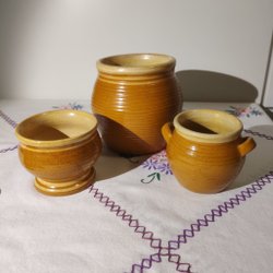 Tre keramik krus i mindre format. En Ekeby 1, ljusbrun keramik krus 7,5 cm hög och 9,5 cm i diameter. Ett Höganäs krus, mörk brun med texten "Höganäs 1/8 l", 7 cm hög och 9 cm i diameter. Ett krus från Gustavsberg, stengods vit kruka med blå blommor, 7 cm hög och 7 cm i diameter.