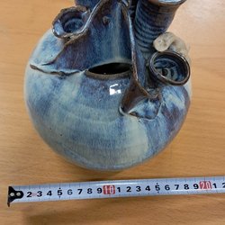 Vas från Tjurkö Stengods i blått och brunt med en dekorativ applikation.