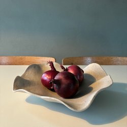 Keramikskål i oregelbunden form. Skålen har ett mönster i brunt och beige. Mått ca. 30 cm i diameter. För mer av min keramik se Instagram Emlaskeramik