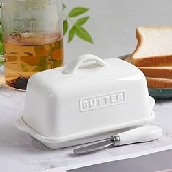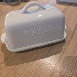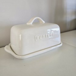 Smörask i vit keramik med texten ”BUTTER” på locket. Praktisk förvaring för smör. 9cm hög och c:a 20cm bred