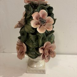 Detta är en porslinshållare för kaffefilter, från märket Horishin Potteries, dekorerad med ett botaniskt motiv av käringtang (Lotus corniculatus).