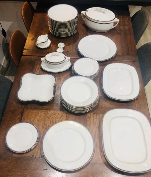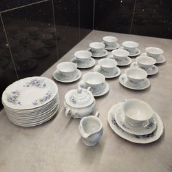 Porslinsservis med tallrikar, skålar och serveringsfat. Porslinsservis till salu – tjeckisk design (Bernadotte)