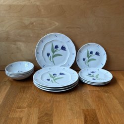 Innehåller tallrikar, uppläggningsfat och serveringsdelar i matchande design.