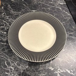 Tallrik med svartvitt randigt mönster runt kanten.Har små skavanker se bild för egen bedömning.
