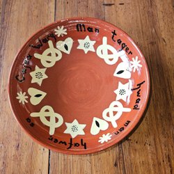 Fint keramikfat i en beige grundfärg med lite spräcklig yta. Keramikfatet är signerat i botten men jag har inte lyckats identifiera vem som är formgivare eller tillverkare.