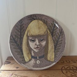 Stort fat med räfflad yta. Ser ut som en snäcka. Fatet är märkt med "934" på undersidan. Tror det kommer från Gefle. Färg Ljung mot rosa. 23 cm brett där det är som bredast. 36 cm långt. Jag ser inte något nagg.