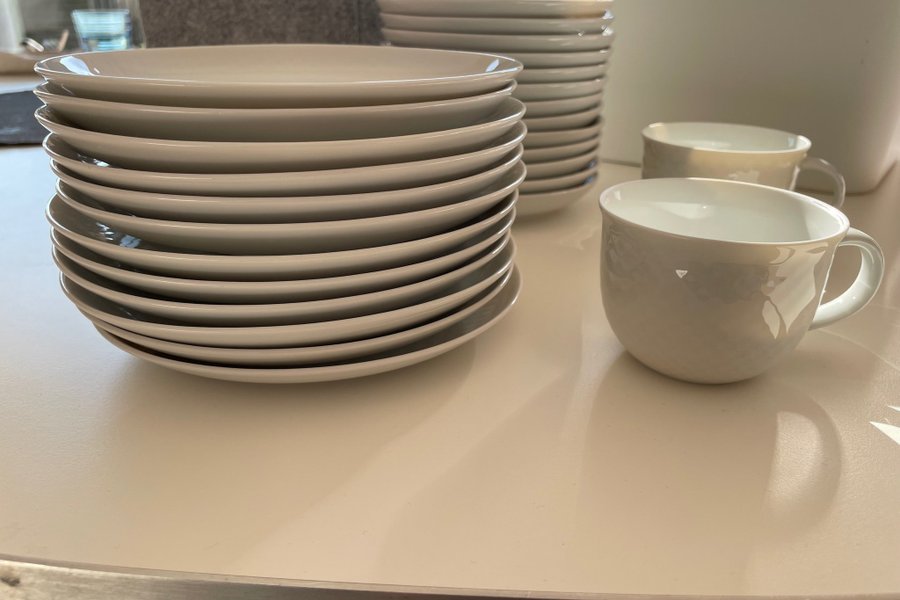 Ett set med vita tallrikar och koppar. 12 koppar med 10 fat och 12 assietter.
