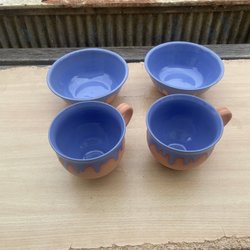 Fyra blåa muggar med en vit insida.