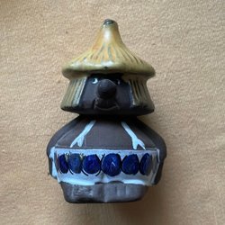 En handgjord keramikfigur föreställande en tomte i blått och vitt. Figuren har en detaljerad skägg och luva. Den är märkt undertill med årtal 1985-7 23cm hög 9 cm diameter nertill