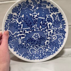 Jultallrik från 1977 med motiv av tomte och renar. Texten "Julen 1977" är tryckt på framsidan. Baksidan har texten "Tillverkad i endast 3.000 exemplar".
