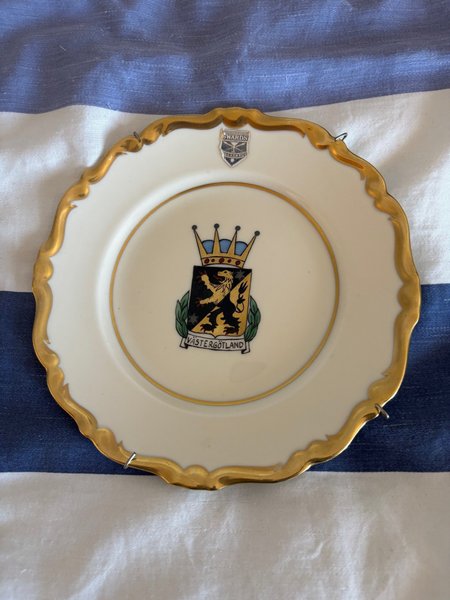 Väggtallrik med motiv av Västergötlands landskapsvapen. Tallriken har en guldkant