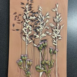 Vacker väggplatta i keramik från JIE Gantofta. Motivet föreställer en detaljerad skogsscen med växter och en liten snigel. Perfekt som en dekorativ detalj i hemmet.