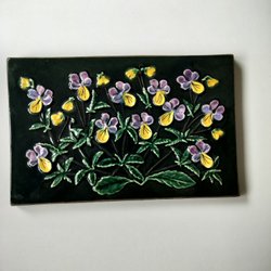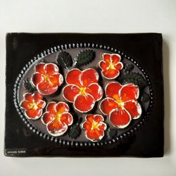 Detta är en väggplatta från Jie Gantofta, designad av Aimo Nietosvuori. Den tillhör serien "Månadsblommor" (Månadens blommor), som producerades på 1970-talet.