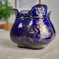 Retro litet fat i mörk lera med grönglaserade blad på toppen. Troligen använts som ljusfat för värmeljus/stearinljus.