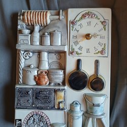 Jie väggklocka i keramik. Drivs med batteri. 30 cm hög och 20 cm på bredaste stället. Något litet skrap i glasyren.