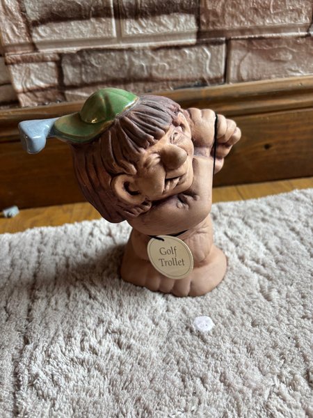 ett troll som spelar golf. Trollet bär en grön keps och håller i en golfklubba. Etiketten "Golf Trollet" hänger runt halsen på figuren.