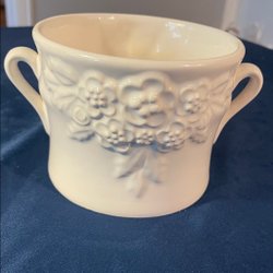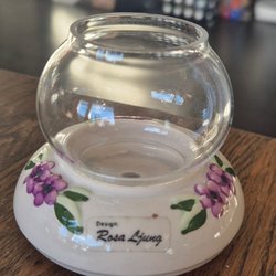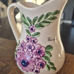 1 stor katt med lila blommor, 18 cm. En liten katt, helvit, 12 cm. Liten kanna,15 cm, liten kantstötning. Fågel med lila blommor! Säljes alla 4 i ”paket”.