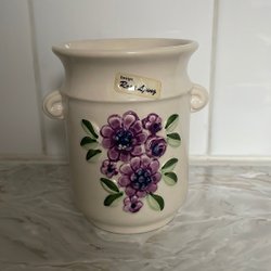En söt vas från Rosa Ljung. Vasen är vit med en lila blomsterdekoration. Vasen är i gott skick och är dekorativ och nagg fri. Finns det intresse så är det bara att buda. Höjd ca 10 cm och diametern 7 cm.