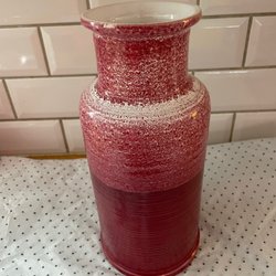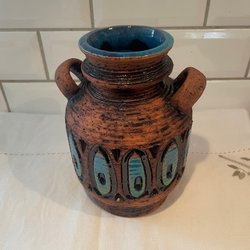 Vas märkt Rosa Ljung i Torekov. Vasen är 15 cm hög och 9 cm i diameter i botten. I mycket bra skick, dock lite mörka prickar i glasyren om man närstuderar och en spricka i glasyren undertill. Syns inte när vasen används. Svårt att fota.