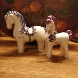 Diverse keramik från Rosa Ljung. Inkluderar två rosa ljusstakar, en vit häst, och kruka/vas i form av ett huvud med blommor.