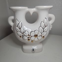 Ljusstake från Rosa Ljung i vitt med bruna blommor och blad. Ljusstaken har två hållare för ljus och ett hjärtformat hål i mitten.
