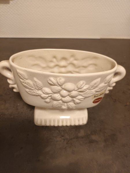 Vitt ytterfoder/kruka med handtag och dekorativa bär och blad. Design Rosa Ljung.