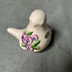 En ljusstake i keramik med dekorativa blommor. Ljusstaken är i en ljus färg med lila blommor och gröna blad som detaljer.