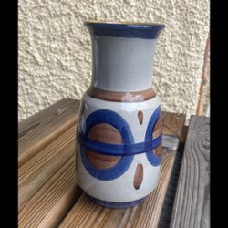 Keramisk form med blå detaljer och upphängningsband.