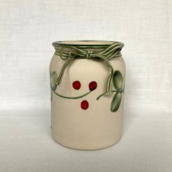 En söt kruka i stengods med blå blommor och blå insida. Ett band är knutet runt krukan.