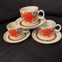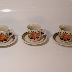 Set med koppar och fat från Vinterling Bavaria. Kopparna har ett blommönster. Diameter fat 13,5cm. Höjd koppar 6,7cm diameter 6,7cm. Ett fat har ett litet nagg, se bild. I övrigt fint använt skick. Samfraktar