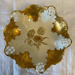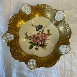 Skålen har ett blommigt motiv och guldförgyllda detaljer.