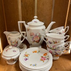 Innehåller: kaffekanna, gräddkanna, sockerskål, 12 vita assietter, 6 vita tefat, 6 blommiga tefat, 6 vita kaffekoppar, 6 blommiga kaffekoppar.