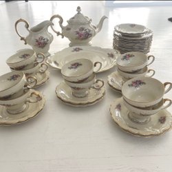Ett klassiskt och tidlöst set från Rosenthal, serien Pompadour. Vackert formade med mjuka barockinspirerade linjer, blomsterdekor i klara färger och guldkant som ger en känsla av elegans.